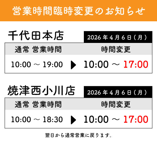2026年4月6日(月)の研修実施に伴い、【千代田本店】【焼津西小川店】の営業時間を臨時変更いたします。